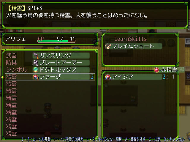 このスクリーンショットの場合、このキャラクターは精霊【ファーグ】を装備しているので【フレイムシュート】というスキルを使用可能になります。